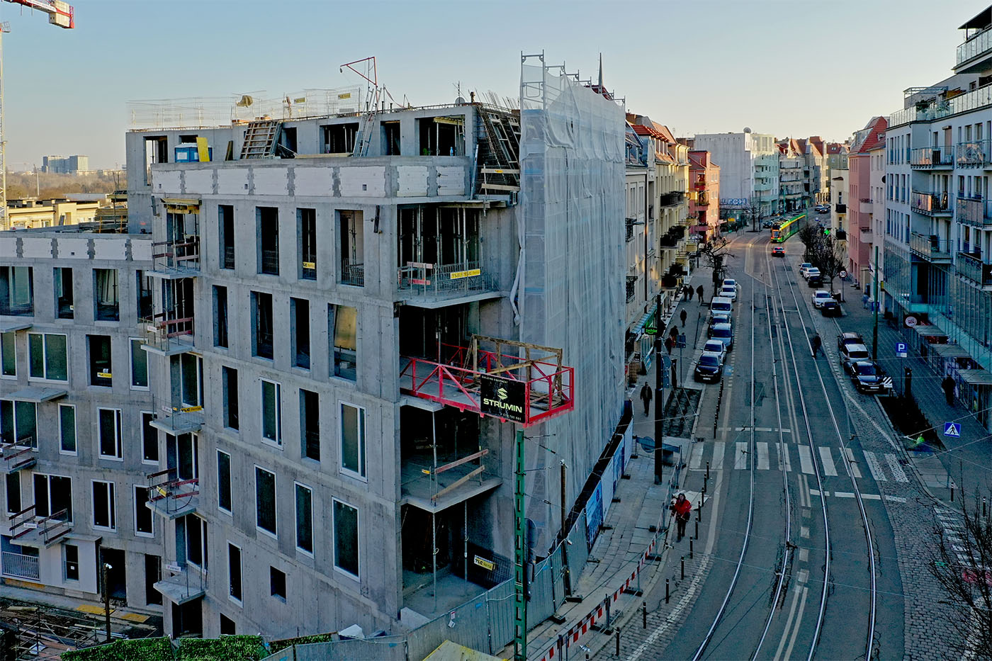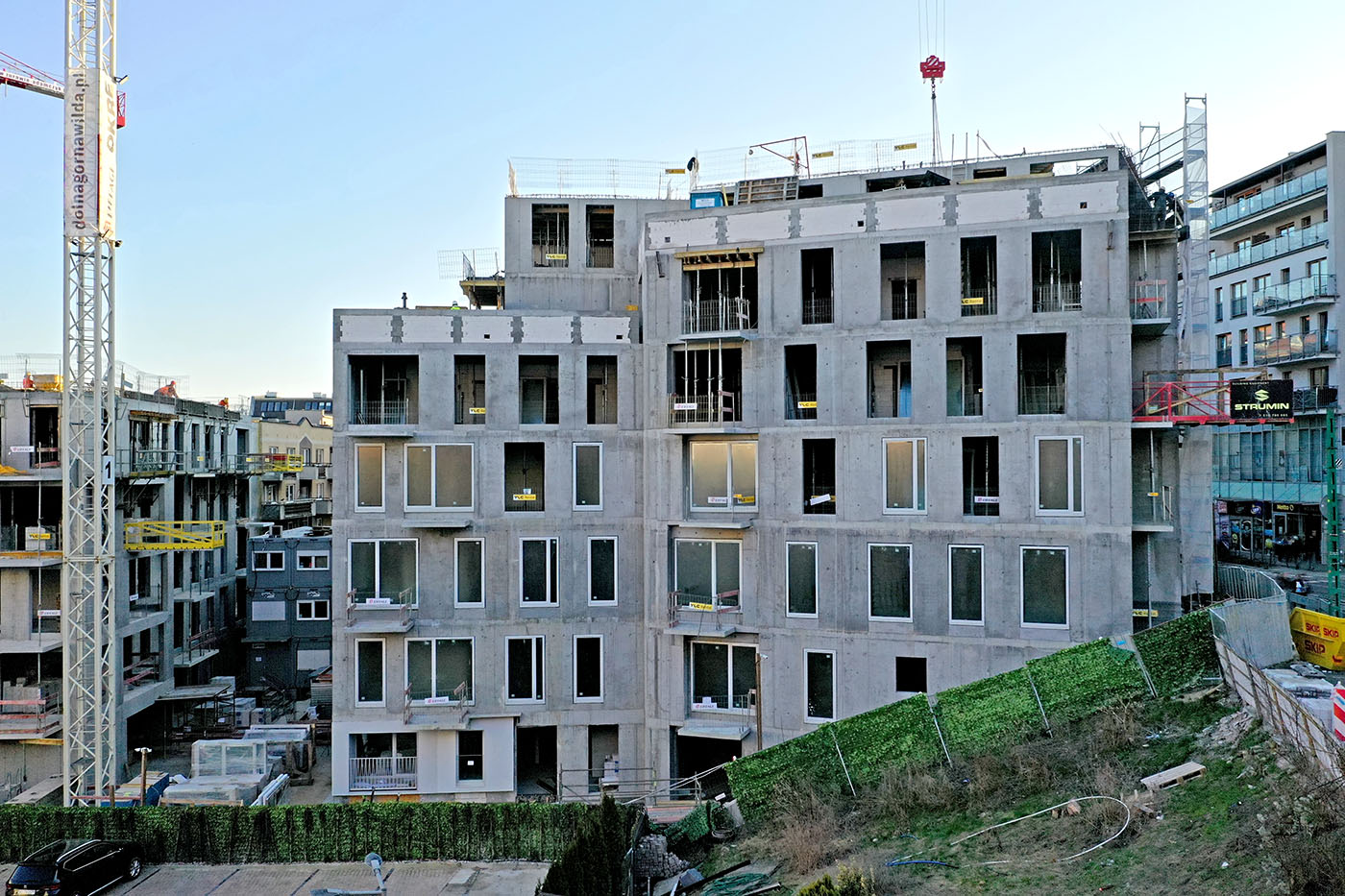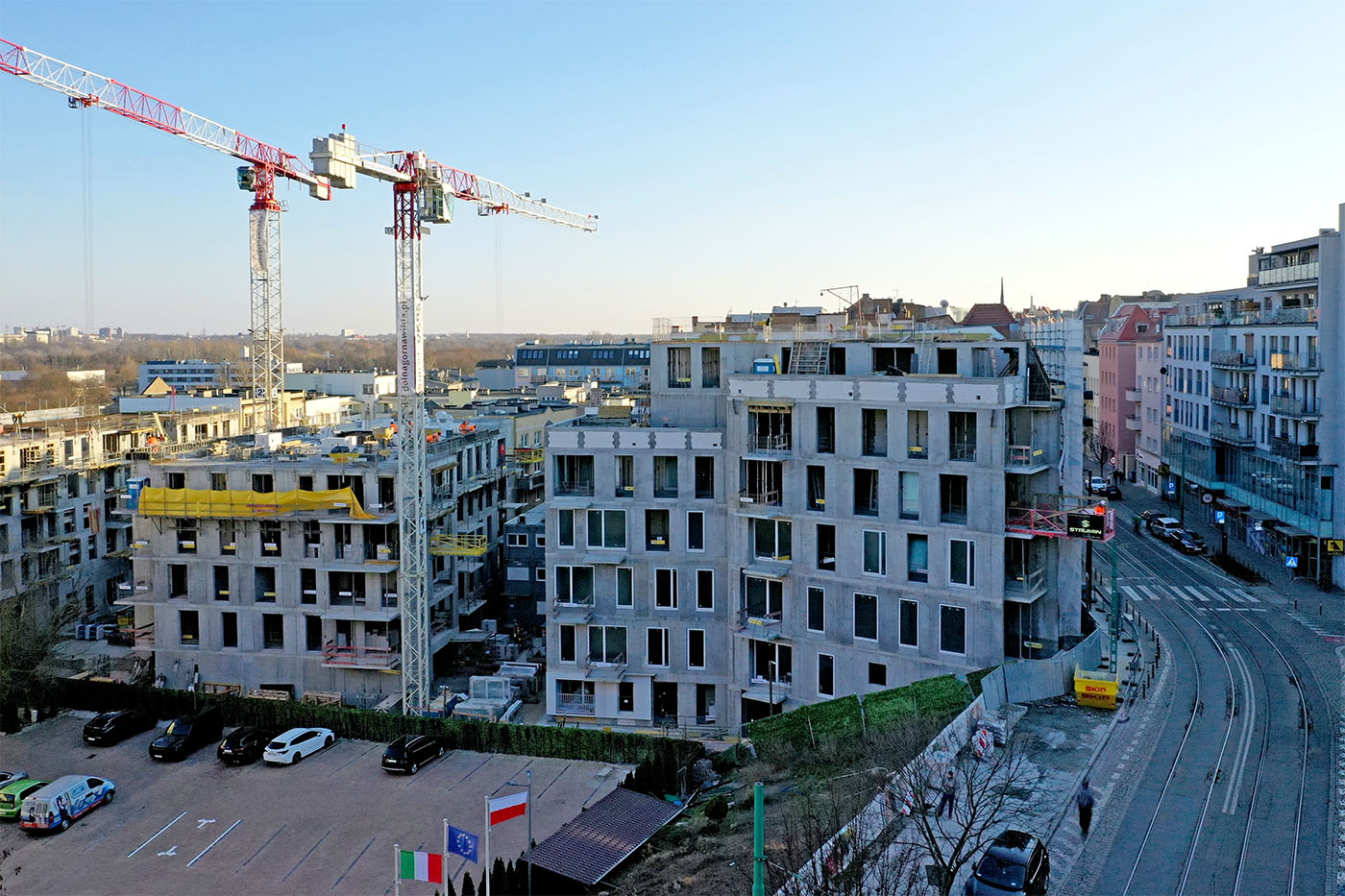 W budynkach od strony ul. Dolna Wilda trwają intensywne roboty żelbetowe na ostatnich kondygnacjach, a niższe piętra są już w większości zamknięte i wyposażane w okna. Widoczny jest także postęp w zakresie prac instalacyjnych wewnątrz budynków.