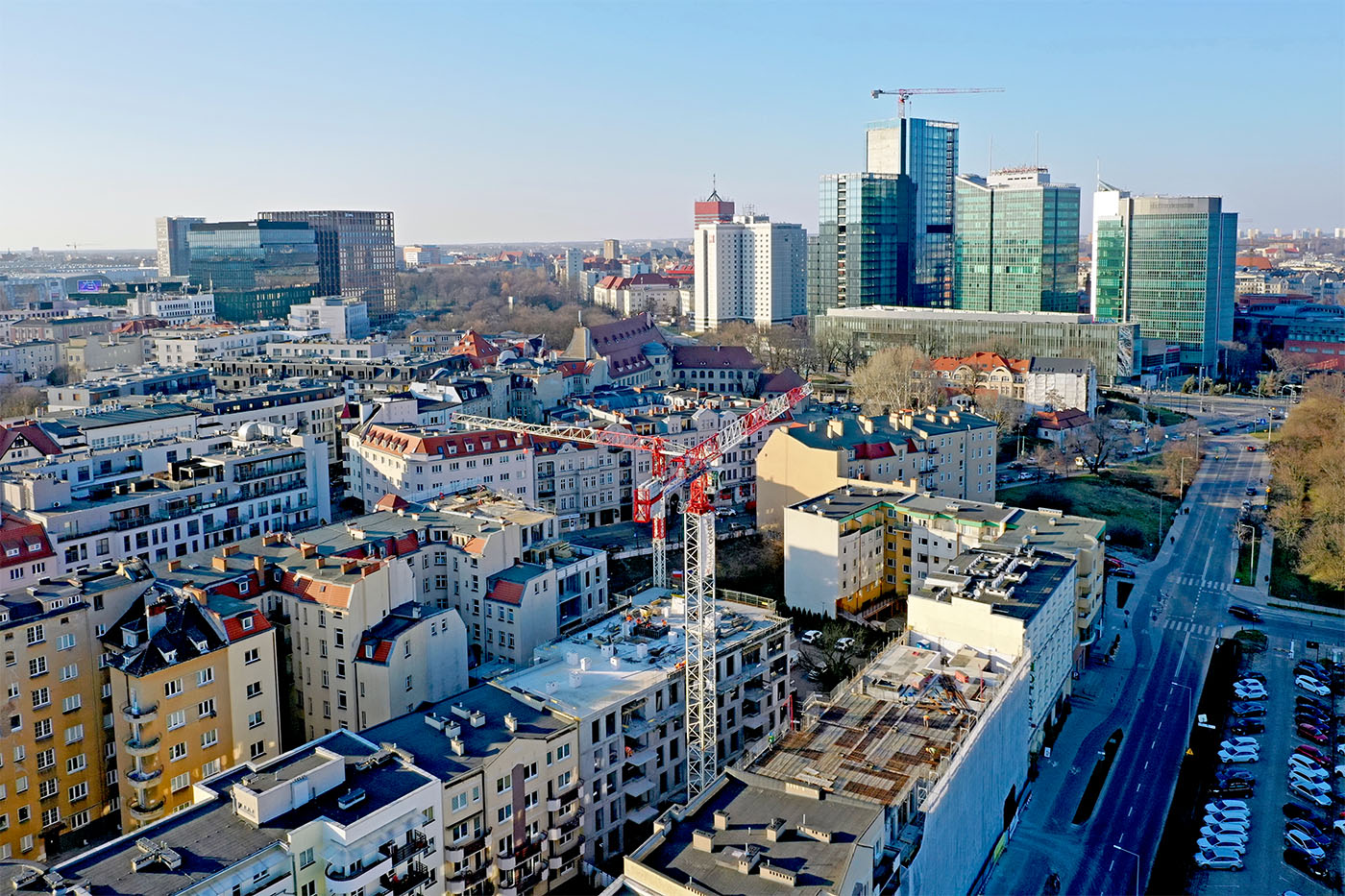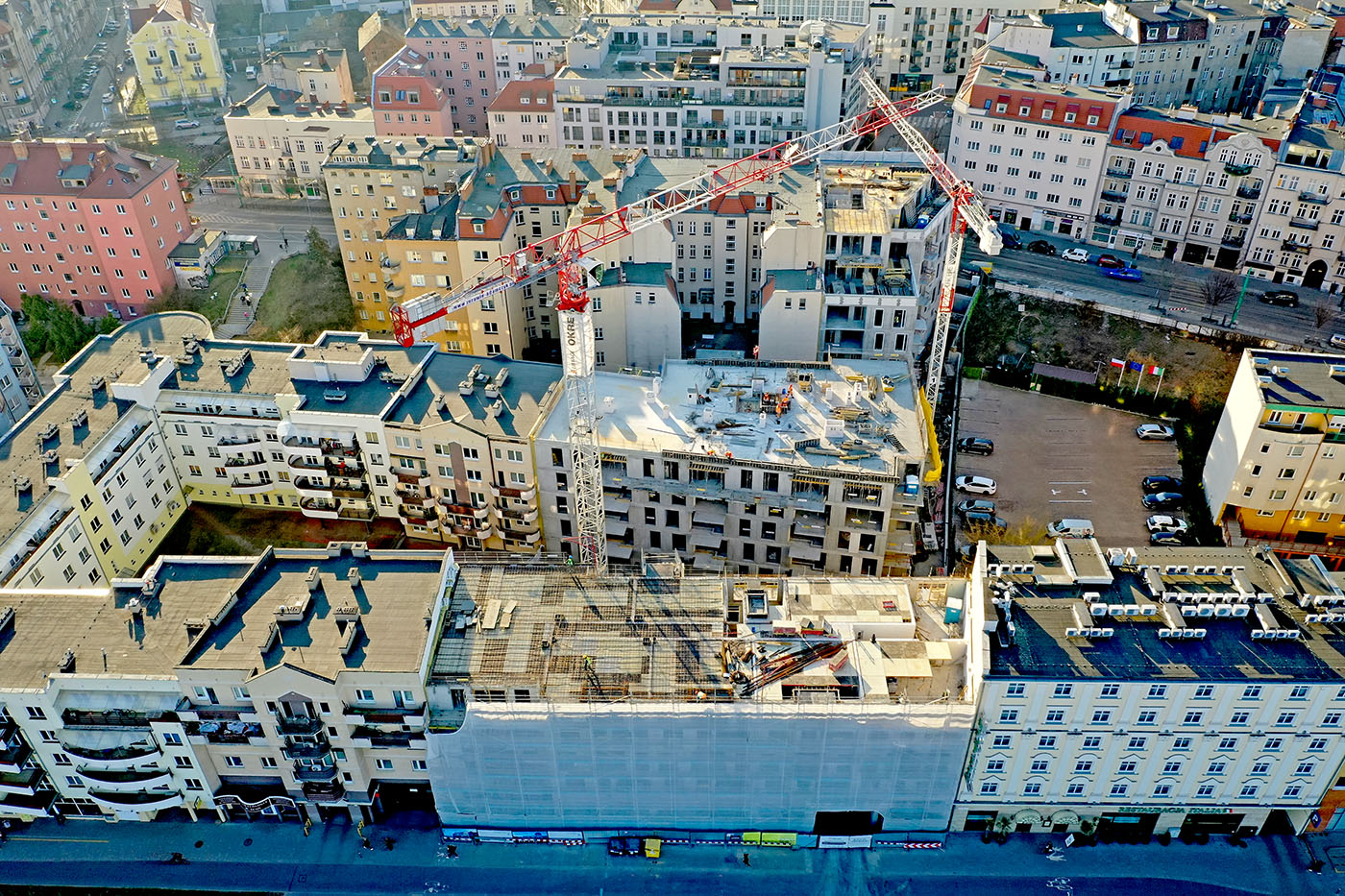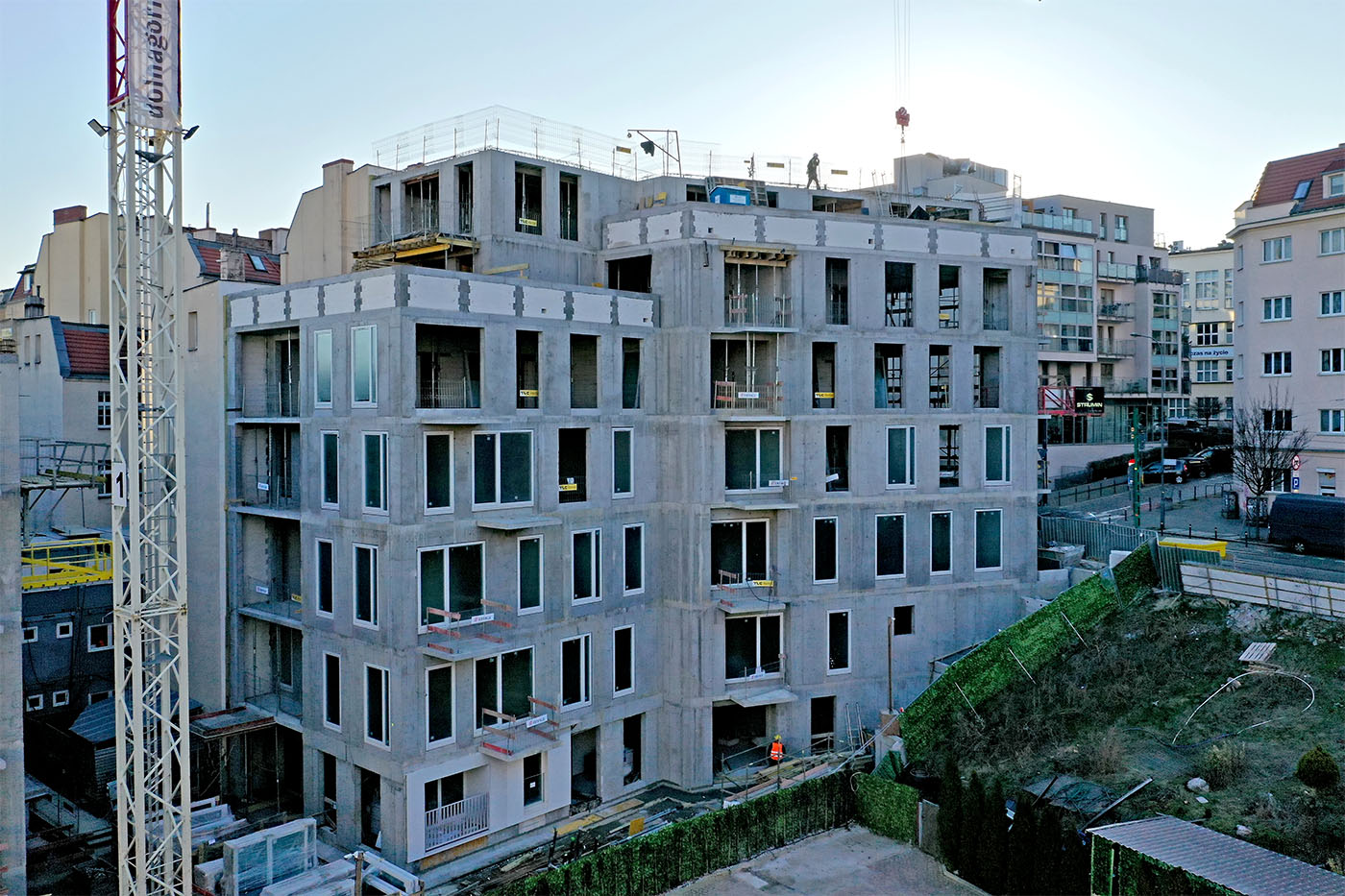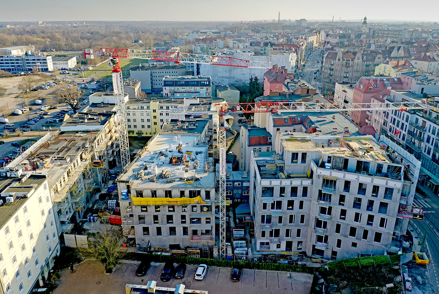 W budynkach od strony ul. Dolna Wilda trwają intensywne roboty żelbetowe na ostatnich kondygnacjach, a niższe piętra są już w większości zamknięte i wyposażane w okna. Widoczny jest także postęp w zakresie prac instalacyjnych wewnątrz budynków.