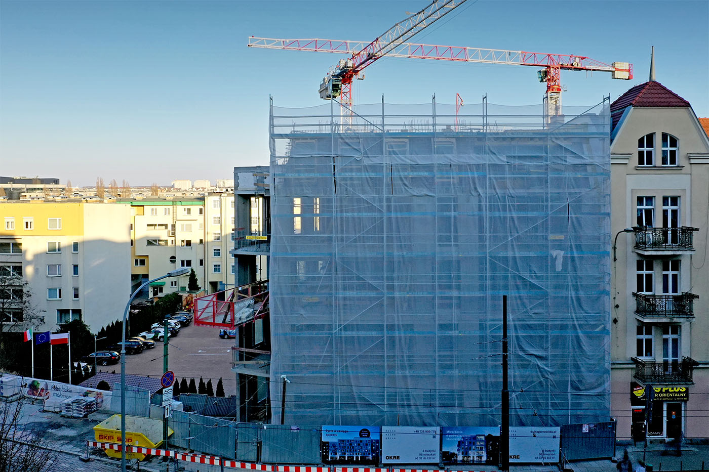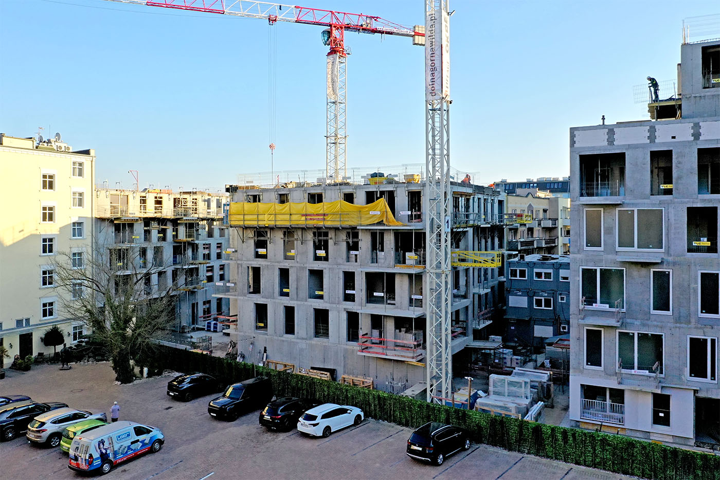 Prace budowlane postępują zgodnie z harmonogramem. Konstrukcja budynku A osiągnęła pełną wysokość, a w części obiektów rozpoczęto już montaż stolarki okiennej oraz przygotowania do prac elewacyjnych.